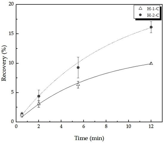 The floatability and kinetics of H-1-C and H-2-C (−106 + 44 µm) were determined in a 400 cm3 UCT (University of Cape Town) microflotation cell, described by Bradshaw and O’Connor [37]. A particulate suspension was prepared by mixing 2.5 g of mineral and 250 mL of distilled water at pH 5 and 25 °C. After 10 min of conditioning, synthetic air was introduced through a syringe from the bottom of the cell at a constant rate of 10 mL/min. Floated products were collected at 0.5, 2.0, 5.5, and 12.0 min; filtered by a vacuum pump; and dried at 40 °C. The cumulative recovery was calculated based on the dry mass of the floated and sunk products over time, whereas the flotation rate (k) and the cumulative recovery as time tends to infinite () were determined by Equation (3), based on a first-order kinetic model.