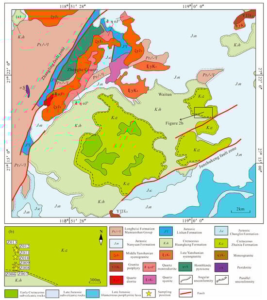 - Duan, Z.; Xing, G.F.; Yu, M.G.; Zhao, X.L.; Jin, G.D.; Chen, Z.H. Time sequence and process analysis of Late Mesozoic volcanism in Zhejiang-Fujian border area. Geol. Rev. 2013, 59, 454–469, (In Chinese with English Abstract). [Google Scholar] [CrossRef]