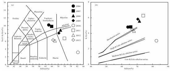 - Liu, L.; Xu, X.S.; Zou, H.B. Episodic eruptions of the Late Mesozoic volcanic sequences in southeastern Zhejiang, SE China: Petrogenesis and implications for the geodynamics of paleo-Pacific subduction. Lithos 2012, 154, 166–180. [Google Scholar] [CrossRef]