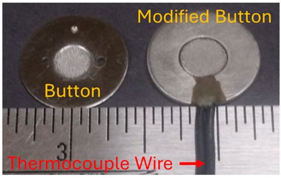Recently, variable temperature infrared spectroscopy studies were demonstrated by using diffuse reflection and a button sample holder [11]. Figure 1 shows a photograph of two button sample holders. The conventional button (left) consists of a stainless-steel base to which stainless-steel wire mesh is welded [12]. The wire mesh contains small cavities into which samples can be loaded. Thin layers of powders consisting of irregularly shaped particles are placed into these cavities. The powder effectively scatters infrared radiation, necessitating the use of diffuse reflection infrared spectroscopy for analyses. The small size, flat bottom, and high thermal conductivity of the button sample holder make it compatible with sample heating and cooling by using flat-surface piezoelectric (thermoelectric) chips. The right button in Figure 1 was modified to provide sample temperature measurements by placing a thermocouple beneath the wire mesh [11,13]. When the modified button was placed on top of stacked thermoelectric chips, sample heating and cooling rates exceeding 2 °C/s were achieved over a 0–150 °C temperature range, and isothermal temperatures could be maintained to within ±0.1 °C [14].