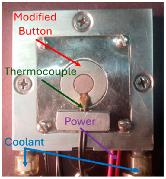 A button consists of a 0.75 in (19 mm) diameter stainless-steel backing with stainless-steel wire mesh spot welded to an indentation at its center (Figure 1). Thin layers of powdered samples are formed within the void spaces of the wire mesh. The flat bottom of the high-thermal-conductivity metal button facilitates precise temperature control when it is mounted on a Peltier thermoelectric device. A modified button incorporating a thermocouple (Figure 1 right) was employed for the variable temperature infrared spectroscopy measurements described here. Figure 2 shows the modified button mounted on the heating/cooling apparatus. The construction and performance of this apparatus are described in detail elsewhere [13,14]. Rapid heating and cooling rates were achieved by using two stacked thermoelectric chips (TECs), which were inside the metal housing shown in Figure 2 [24,25]. Sample temperatures were adjusted by controlling the heat transferred between the upper and lower TECs.