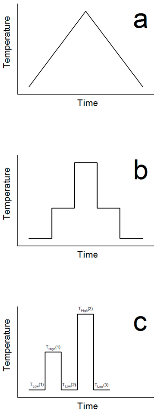 (a) Linear heating/cooling ramp, (b) stair-step, and (c) step-up/down temperature programs.