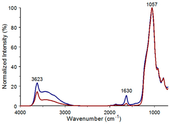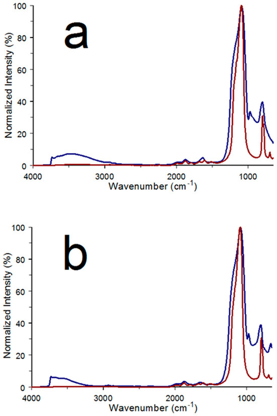 Infrared spectra for α-quartz (red) and silica gel (blue) (a) before heating and (b) at 150 °C.