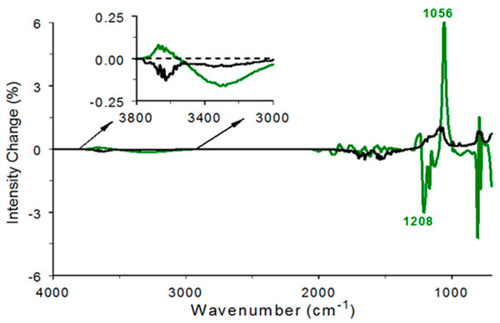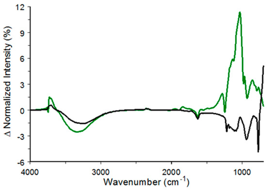The silica gel infrared spectrum changes in Figure 4 are largely associated with loss of intensity above 3000 cm−1 due to sample dehydration. The reversible (green) and irreversible (black) changes to the silica gel spectrum are shown in Figure 7. Both curves exhibit broad negative bands above 3000 cm−1 that are indicative of water loss. The shapes of these broad bands differ, and the reversible band area exceeds the irreversible band area. Small positive peaks near 3700 cm−1 result from Si-OH functionalities that have lost hydrogen bonding interactions due to water removal, which caused the Si-OH vibration band to shift to higher wavenumbers. Below 2000 cm−1, reversible spectrum changes were mostly positive, and irreversible intensity changes were mostly negative. Both curves exhibited negative intensities near 1630 cm−1, which corresponded to the H-O-H bending vibration. This indicates that both reversible and irreversible water losses were detected in the 0.16 kPa p(H2O) dry air purge environment.