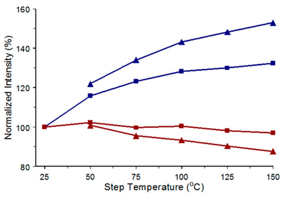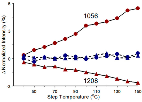 Intensity versus step temperature (red) trends at 1208 cm−1 (triangles) and 1056 cm−1 (circles). Dashed lines denote intensities after cooling (blue) back to 30 °C.