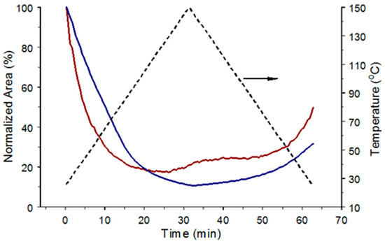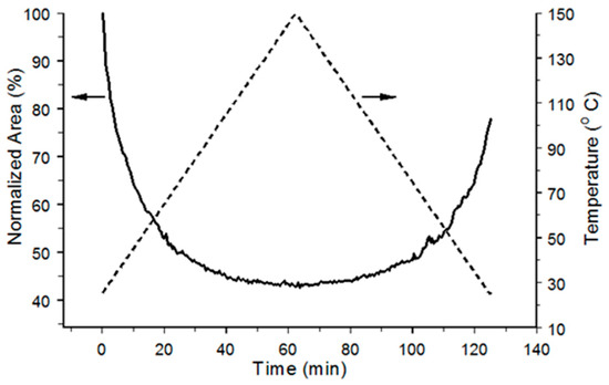 Figure 8 shows the H-O-H bending vibration band area (1700–1600 cm−1) as a function of temperature. Areas were normalized by dividing them by the initial 30 °C area. The dashed line in Figure 8 is a plot of the sample temperatures measured during the 2 °C/min heating and cooling ramps. The exponential decrease in the bending vibration band area during sample heating reflects the temperature-dependence of sample dehydration mechanisms. About 45% of the initial band area remained after heating the sample to 150 °C. Some of the water lost by heating to 150 °C was regained by the sample during cooling, resulting in an intensity increase after 60 min. Because the H-O-H bending vibration band area only returned to 80% of its initial value, about 20% of the water originally contained in the sample was irreversibly lost under these experimental conditions.