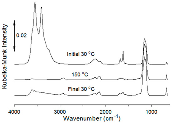 Diffuse reflection infrared Fourier transform spectroscopy (DRIFTS) is applicable to materials that scatter infrared radiation. It is well suited for mid-infrared spectroscopic analyses of mineral powders [15,16,17]. In addition to the scattering coefficient, diffuse reflectivity is determined by wavelength-dependent sample absorptivity and the cumulative distance that infrared radiation passes through the irregularly shaped particles [18,19,20]. When absorptivity is too high, near-zero reflectance is recorded. The resulting “bottomed-out” reflectance spectrum bands provide no useful sample information. Wavelength regions of high absorptivity may also exhibit the Reststrahlen effect, refs. [21,22] wherein band shape distortions appear near absorbance maxima. Diluting sample powders with non-absorbing alkali salts can minimize these spectral artifacts. The diluent isolates particles and reduces the amount of sample material exposed to radiation. Alternatively, average radiation path lengths can be reduced by employing a button sample holder and thin powder layers [12]. With this approach, spectrum artifacts caused by interactions between the sample and diluent are avoided. This is particularly advantageous for temperature perturbation studies because the addition of a diluent to a sample can significantly alter the thermal properties under scrutiny.