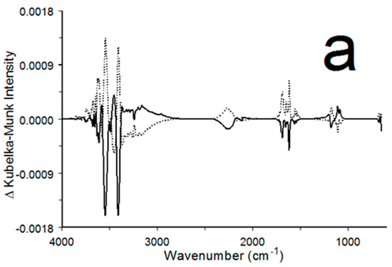 The integrated intensities for both plots in Figure 13 began to decrease above 50 °C and continued to decrease until 100 °C. The overlap of the circles and squares below 60 °C in Figure 13 (region I) indicates that infrared spectrum changes at these temperatures were minimal. These changes are characterized by Figure 14a, which shows the results of subtracting the initial 30 °C spectrum from the spectrum obtained at 50 °C (solid line) and by subtracting the 50 °C spectrum from the spectrum obtained after cooling the sample from 50 to 30 °C (dotted line). The solid and dotted line difference spectra are nearly mirror images. When the sample was heated to 50 °C, the solid line shows that spectrum changes were dominated by O-H stretching (>3000 cm−1) and H-O-H bending (1685 and 1620 cm−1) vibration band intensity losses. The 0.0015 intensity loss at 3550 cm−1 in Figure 14a represents 3.75% of the O-H stretching vibration band intensity in the initial 30 °C spectrum, confirming that intensity loss was minimal. In addition, intensity variations were detected for sulfate anion vibrations over the 1200–1000 cm−1 range and at 670 cm−1. The intensity loss between 2300 and 2000 cm−1 is associated with the loss of sulfate vibration overtone and combination bands [49]. Intensity increases in the dotted line plot at the same wavenumbers as the negative solid line features indicate that the spectrum changes that occurred due to sample heating were reversed when the sample was cooled. The broad 3400–3000 cm−1 features in the two difference spectra represent hydrogen-bonded water molecules. Intensity in this region increased when the sample was heated to 50 °C and then decreased when the sample was cooled back to 30 °C. This suggests that some of the water molecules responsible for the 3550 and 3400 cm−1 bands in the initial 30 °C spectrum remained in the solid state when the sample was heated but adopted orientations that provided more diverse hydrogen bonding interactions. Loss of broad band intensity over the 3400–3000 cm−1 range after cooling likely resulted from these water molecules returning to their 30 °C configurations.