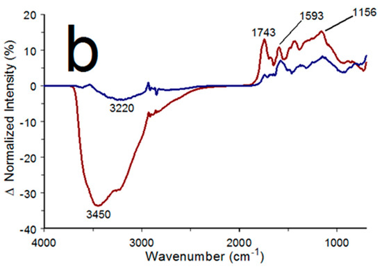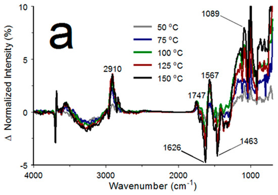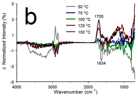 A lignite coal sample was analyzed by subjecting it to a step-up/down temperature program starting with TLow at 25 °C and 25 °C step intervals to 150 °C. Five-minute isothermal periods were inserted prior to each THigh spectrum measurement. Figure 15a shows the infrared spectra of the lignite coal sample obtained at 25 °C (blue) and 150 °C (red). Both spectra have similar band profiles but with different relative intensities. The broad feature extending from 3600 to 2200 cm−1 can be assigned to overlapping O-H stretching vibration bands. In general, band intensity at a lower wavenumber represents the hydroxyl groups involved in stronger hydrogen bonding [55]. The narrow bands at 2925 and 2850 cm−1 superimposed on the broad O-H stretching vibration band are representative of asymmetric and symmetric CH2 stretching vibrations, respectively [56]. Band intensity below 2000 cm−1 characterizes the organic constituents of the coal sample and likely consists of several overlapping C-C and C-O stretching and C-C-H, H-C-H, C-O-C, and C-O-H bending vibrations [57]. The 1600 cm−1 band has been assigned to aromatic ring C-C stretching vibrations, and the 1282 cm−1 band is associated with C-O stretching vibrations [58]. Figure 15a reveals that the O-H stretching vibration band intensity decreased and intensities for overlapping bands below 2000 cm−1 increased after the lignite coal sample was heated to 150 °C. Figure 15b shows that the cumulative reversible spectrum changes (blue) were smaller than the irreversible (red) changes. Most of the irreversible changes can be attributed to sample dehydration. In addition to dehydration, the loss of organic volatiles containing hydroxyl groups and oxidations of hydroxyl groups to carbonyl functionalities likely contributed to the reduction in the O-H stretching vibration band intensity. The spectrum variations below 2000 cm−1 suggest that loss of substances containing hydroxyl groups was correlated with band intensity increases for a variety of organic functionalities. This intensity increase may have been caused by loss of hydrogen bonding between polar organic functionalities and the desorbed water. The positive peak at 1743 cm−1 likely represents carbonyl functional groups in the coal sample.