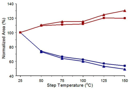 Normalized infrared spectrum intensities at 2850 cm−1 (red) and 2925 cm−1 (blue) as a function of lignite coal step temperature. Triangles represent intensities in spectra measured at the step temperatures and squares represent intensities in spectra obtained after subsequently cooling to 25 °C.