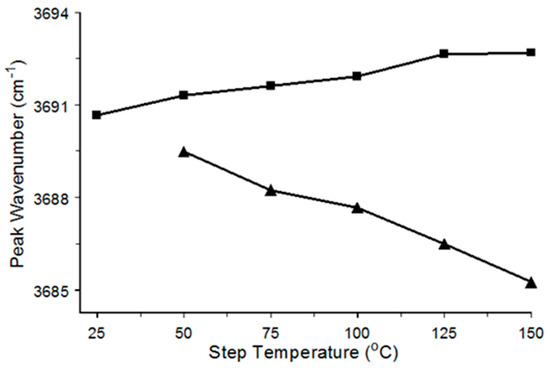 Figure 19a shows a bituminous coal infrared spectra obtained initially (blue) and after heating the sample to 150 °C (red). Compared to the lignite results, the bituminous coal spectra exhibited a much lower O-H stretching vibration band intensity, and vibration bands below 2000 cm−1 associated with organic functionalities were sharper and better resolved. Differences between the bituminous and lignite coal spectra are consistent with a lower organic material content for the higher rank bituminous coal sample. Unlike the lignite spectra, the bituminous coal spectra contained sharp peaks above 3600 cm−1 that can be assigned to hydroxyl groups that are not involved in significant hydrogen bonding interactions [55]. These hydroxyl groups are likely associated with clay mineral impurities [54]. The ca. 8% intensity at 3690 cm−1 in Figure 19a suggests that these impurities represent minor components of the coal sample. Figure 19b is an overlay of the cumulative reversible (blue) and irreversible (red) spectrum differences resulting from heating the bituminous coal to 150 °C. Reversible changes included O-H stretching vibration band intensity loss at 3697 cm−1 and gain at 3682 cm−1, a broad O-H stretching vibration band intensity loss with minimum at 3272 cm−1, and various intensity gains and losses below 2000 cm−1. The sharp peaks at 3697 and 3682 cm−1 in the blue difference spectrum in Figure 19b represent changes to narrow regions of the 3690 cm−1 O-H stretching vibration band in Figure 19a. Figure 20 shows plots of the band maximum wavenumber for this peak in the measured spectra as a function of sample temperature. The triangles show that the band maximum gradually shifted to lower wavenumbers with increasing sample temperature. This shift was a consequence of the increasing intensity loss at 3697 and gain at 3682 cm−1 with increasing temperature, causing the peak maximum to gradually shift to lower wavenumbers. After cooling from each THigh(n) step, the trend for the TLow(n+1) spectra (squares) in Figure 20 reveals that the band maximum at 25 °C increased slightly after successive heating steps, indicating that the structure change responsible for this wavenumber shift was not completely reversible.