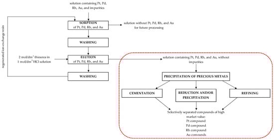 During the elution, a resin is washed with a solution of a specific eluting agent (called eluent). Many eluents were already tested in the publications concerning the recovery of Pt, Pd, Rh, and/or Au, e.g., HCl [23,24,25,26,27,28], thiourea [26,27,29,30], thiourea in H2SO4 [23,24,28], thiourea in KOH [23,24], thiourea in HCl [25,28,29,31,32,33], thiourea in NaOH [25,28], NH4SCN [23,24], NaOH [29], NH4Cl [29], NaCl [26,27,29,30], HNO3 [29], Na2CO3 [26,27,29,30], NaSCN [25], acetone in HCl [34], NaClO4 [26,27], sodium citrate [26,27], NaHSO3 [26,27], and Na3PO4 [26,27]. In many cases, thiourea is considered the best eluting agent, as it has a high affinity toward precious metals, thanks to sulfur, which is part of its chemical structure. Many publications focus on the sorption and elution aspects of the ion-exchange method, attempting to selectively recover precious metals from a multi-component solution. And it is indeed very important; however, almost no publications focus on processing solutions after elution, known as eluates. Obtaining a product with a high market value is the core goal of every technology, which allows researchers to determine whether it can be further implemented in the industry or not.