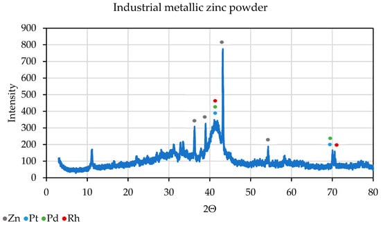 This means that it is difficult to calculate how much excess metallic zinc powder was used in a given experiment. However, a good indicator of whether cementation has taken place with full efficiency is the measurement of the pH of the solution on an ongoing basis (Table 2). When using industrial Zn, at the beginning of the process, the pH is within the range of 0.16–0.53, but it increases rapidly to a pH of ~5.3 with the addition of approximately 0.75 g of Zn, which would indicate a complete conversion of free acid. This value may be the limit point for carrying out the cementation process using industrial metallic zinc powder, as an increase in the amount of added Zn is not required. An XRD pattern analysis of the selected precipitate after cementation was performed (with the addition of 0.75 g of Zn).