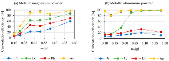 When the metallic aluminum powder is used as the cementing agent (Figure 5b), there is a visible tendency to selectively precipitate gold and palladium in the form of a concentrate. Additionally, in this case, there was a shift in the pH solution to a level of approximately 3.31 (with the addition of 0.75 g of Al). This is the point at which the efficiency of gold and palladium cementation is practically the highest and the addition of more aluminum dust is not required. This metal can be used to selectively separate Au and Pd in the form of their combined concentrate from Pt and Rh by leaving them in the solution. Similarly, when using magnesium, at a pH > 3 additional amounts of precipitate were formed. However, this did not appear to hinder the cementation of Pd and Au. This could be attributed to the lower pH of the solution. The presence of unneutralized H+ ions in the solution was likely crucial for the cementation reaction of various complexes of precious metals, as can be seen in the cementation equations with Zn.