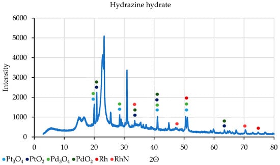 Analysis of the data in the diffractogram in Figure 6 indicates that Pt and Pd compounds are formed in the sample following reduction with hydrazine hydrate, mainly oxides such as Pt3O4, Pd3O4, PtO2, and PdO2. In addition, rhodium is visible in the precipitate, unbound and bound to nitrogen from hydrazine hydrate, forming RhN. When using Au, its amount was probably too low for the signal to be visible in the diffractogram.