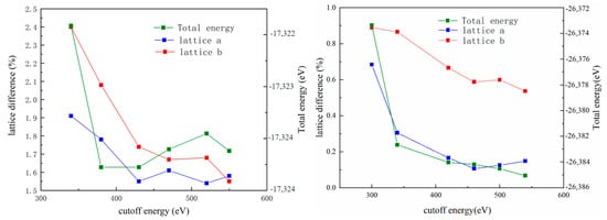 Results of the convergence test for the cutoff energy evaluation of talc (left) and muscovite (right).