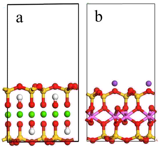 The (001) surface slab of talc (a) and muscovite (b) after optimization. The balls in red, yellow, white, green, and purple represent O, Si, H, Mg, and K atoms, respectively.