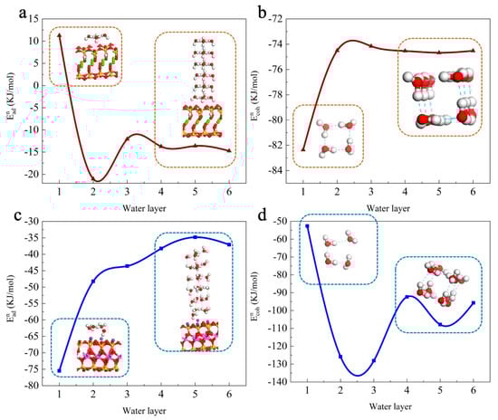 As shown in Figure 3a,c, the calculated interfacial energy changed dramatically with the increase in water layers. The main differences occurred at the second water layer, and as the water layers increased, the interfacial energy changed around a constant value. It is interesting to note that the first water layer needs a higher interfacial energy to stay on the talc (001) surface due to the natural hydrophobic property of the talc surface. After that, the interfacial energy decreased, which is water adhesion between the water layer and the first layer at the talc surface. The interfacial energy remained constant. This implies that the impact of the solid surface on the water layer is limited to within three water layers, and the interfacial energy beyond the third layer is essentially the cohesion energy between two water monolayers. The energy of adhesion can be considered as the energy released when one liquid or solid surface comes into contact with another liquid or solid surface. Comparing the interfacial energy in Figure 3a,c, the negative interfacial energy always occurred at the model of water on the muscovite surface, which means the release of energy when the water layers contact the muscovite surface. A molecule will be stable at the solid surface if there are more attractive forces and fewer repulsive forces. Attractive forces lower the potential energy of the molecules, while repulsive forces increase the potential energy of the molecules. The first water layer on the muscovite surface has the biggest energy release and the most stable conformation, according to energy minimization. The attractive forces lead to the spread of water on the muscovite surface. The interfacial energy of the first water layer on the nonpolar talc surface is positive, and the value of the interfacial energy is smaller than that on the muscovite surface, which reveals the weak repulsive force.