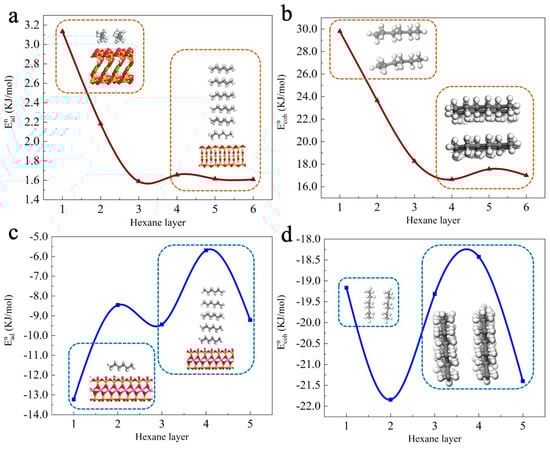 The cohesion energy within the th water monolayer was calculated by Equation (7), as shown in Figure 3b,c. Comparing the cohesion energy of talc and muscovite, the water layer on muscovite showed weak intermolecular interaction within the first layer, while the talc surface showed a strong interaction. There was more ion–dipole bonding at the surface of muscovite than at the surface of talc, making the muscovite surface more reactive to the water layer. As shown in Figure 3c, the strong interaction between the muscovite surface and the water monolayer depressed the intermolecular interaction. The interfacial energy of the water layers on muscovite being larger than that of the talc surface also reflects the stronger activity of the muscovite surface. The nonpolar liquid hexane on the talc and muscovite surfaces was calculated as a reference, as shown in Figure 4.