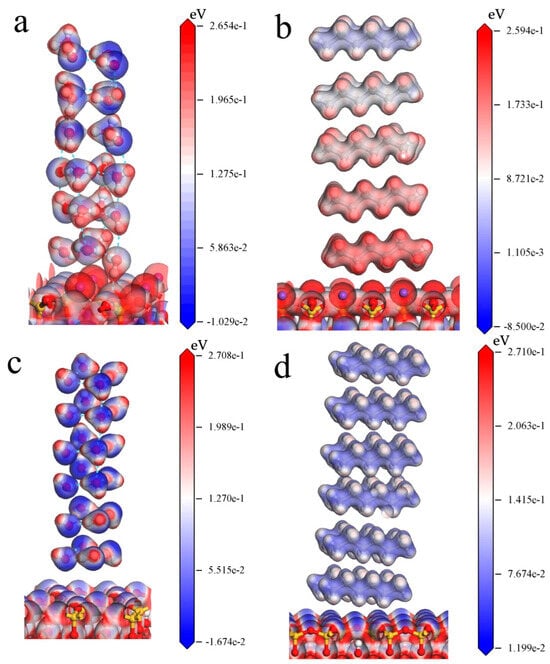 The surface electrical potential difference distribution of water on muscovite (a) and talc surfaces (c), as well as the hexane on muscovite (b) and talc (d) surfaces.