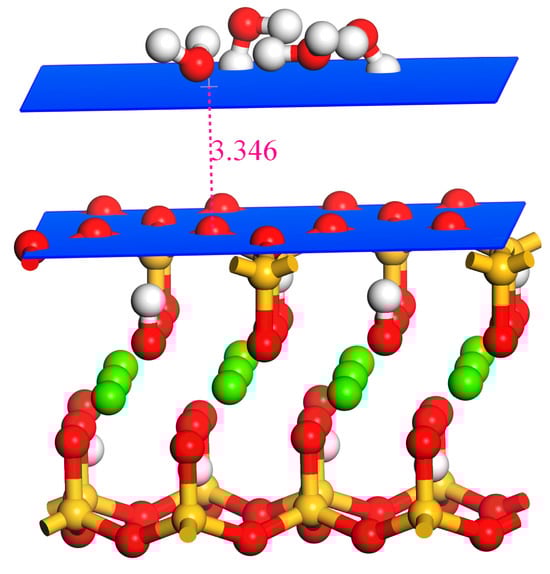 The polar liquid water and nonpolar liquid hexane showed different behaviors on the surfaces of muscovite and talc. In addition to the contact angle identification, the electrical charge distributions were calculated to gain more insight into the interface interactions. Figure 5 shows the distribution of the total electronic charge density on the distant isosurface. The K+ and O2− were alternative arrangements on the exposed muscovite (001) surface, where K+ shows the positive charge, and O2− shows the negative charge. The charge distribution on the water molecule was heterogeneous; two hydrogen atoms were surrounded by positive charge, while the negative charge was distributed around the hydrogen atom. Two different interactions between water molecules and the muscovite surface existed, as shown in Figure 5a: one is the O atom of H2O with the K atom of the muscovite surface, which contributes to the electrostatic interaction; the other is the hydrogen bond between the H atoms of H2O and the O atom of the muscovite surface, which led to the hydrophilicity of the muscovite surface. All the interactions contributed to the spontaneous spread of water on the muscovite surface. The water layer on the muscovite surface was the most stable structure, according to energy minimization. On the hydrophobic talc (001) surface, only the O atom was exposed, which led to the negative charge. Comparing the electrical potential of the talc and muscovite surfaces, the surface charge of talc was significantly smaller than that of muscovite. The water layer gradually migrated away from the surface during the optimization due to the electrostatic interaction until the distance reached 3.346 Å away from the talc surface, as shown in Figure 6, which was consistent with previous studies that showed a water exclusion zone and/or gas “gap” with a thickness of 3.5 Å at the hydrophobic surface [,].