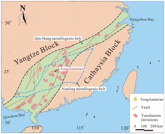 The Tongtianmiao pluton, located within the South China Block, has recently been identified as a significant lithium resource. The South China Block was formed by the collision of the Yangtze and Cathaysia blocks (Figure 1), which underwent multiple episodes of tectonic–magmatic events and crustal material reorganization since the Neoproterozoic era [19,20,21]. During the Late Mesozoic to Cenozoic, the region was subjected to the influences of Pacific, Eurasian, and Indian tectonic systems, which contributed to a highly complex geological structure with intense intracontinental mobilized mineralization processes [22,23,24]. This region serves as a significant base for rare metal deposits in China, with notable enrichment of W, Sn, Li, Be, Ni, Ta, and weathering crust-type rare-earth elements that have attracted global attention [25,26,27].