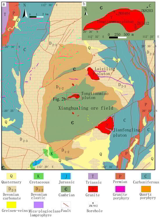 (a) Geological sketch showing the strata and intrusion distribution in the Xianghualing ore field (modified from Yuan et al., 2008 [14]); (b) geological sketch showing the horizontal distribution of sampling boreholes ZK6404, ZK7412 and ZK8203, CRS: WGS84.