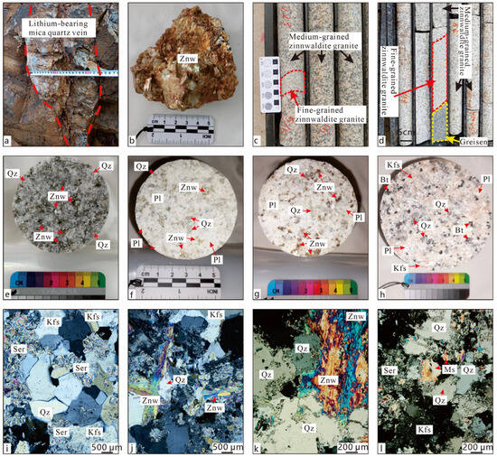 Photographs and micrographs of representative rocks: (a) lithium-rich mica quartz vein; (b) zinnwaldite specimen; (c) fine-grained zinnwaldite granite veins intersecting medium-grained zinnwaldite granite; (d) grain size variation and greisen vein in zinnwaldite granite; (e) greisen; (f) albitized zinnwaldite granite; (g) zinnwaldite granite; (h) biotite monzonitic granite; (i) sericitized granite thin section; (j) zinnwaldite granite thin section; (k) greisen thin section; (l) altered quartz-enriched granite thin section. Pl—plagioclase, Kfs—potassium feldspar, Qz—quartz, Znw—zinnwaldite, Ms—muscovite, Bt—biotite, Ser—sericite.