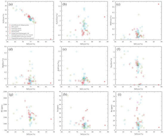Plots of SiO2 vs. (a) Al2O3; (b) Fe2O3T; (c) MnO; (d) MgO; (e) CaO; (f) Na2O; (g) Rb; (h) Sr; and (i) Ba for the Tongtianmiao granitic rocks and other intrusions in the Xianghualing ore field (data obtained from previous research [7,8,11,18]).