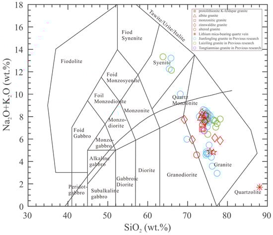 Chemical classification of Tongtianmiao plutonic rocks using the total alkali versus silica (TAS) diagram, modified from Middlemost (1994) [38].