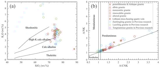 (a) SiO2 vs. K2O diagram, modified from Peccerillo and Taylor (1976) [39]; (b) A/CNK versus A/NK plots of granites from the Tongtianmiao pluton, based on the diagram of Maniar and Piccoli (1989) [40].
