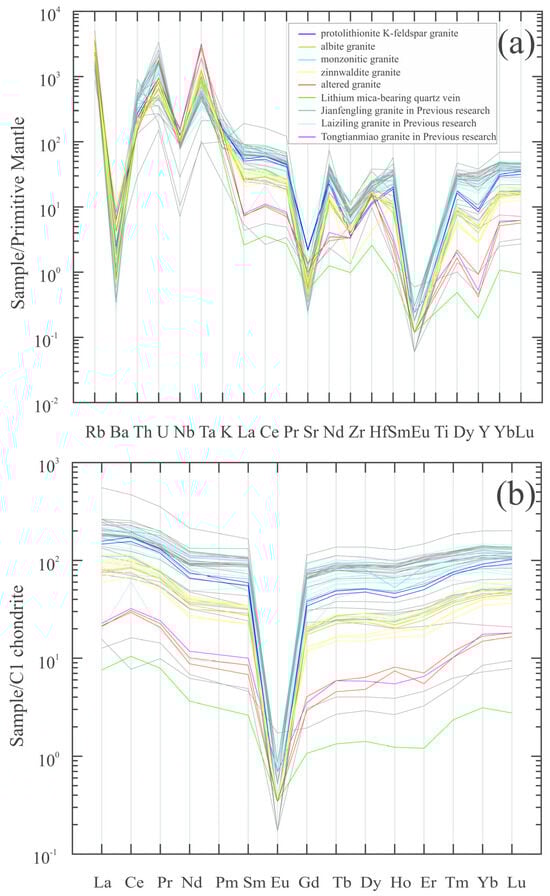 The primitive mantle normalized diagram of trace elements and the chondrite-normalized REE patterns of Tongtianmiao granites exhibit strong consistency, with the exception of three samples from a lithium mica-bearing quartz vein and altered granites (Figure 8). This consistency suggests a common genetic origin for these granites. The differences in their contents imply that they have all undergone intense crystalline differentiation and are products of different stages of evolution. Tongtianmiao granites are similar to some samples of Jianfengling and Laiziling granites in the primitive mantle-normalized diagram of trace elements and the chondrite-normalized REE patterns (Figure 8), which may imply a certain degree of similarity in their magma sources. The fractionation of light and heavy REEs is not obvious in any of the Tongtianmiao granites (average LREE/HREE = 4.00), and it is possible that late-stage F-rich fluids were more conducive to HREE enrichment [16].