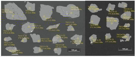 Like high-U zircon, monazite tends to heal after radioactive damage and generally does not suffer from significant Pb loss due to severe lattice destruction [42,43,44]. Therefore, when zircons in rock samples are generally high in U, coexisting monazite is a more suitable alternative mineral for dating [45]. Single-grain monazite grains selected from the zinnwaldite granite in Tongtianmiao granite samples show distinct characteristics in CL images (Figure 10). The grains of monazite in the samples exhibit a range of sizes and display irregular morphologies. The composition of the monazite is uniform, and the growth zones are basically undeveloped. The Pb ages for 27 monazites are shown in Table S3. In the case of ordinary Pb content without correction, the Tera-Wasserburg antiharmonic map was drawn to obtain the lower intersection age. Monazites from granite (sample ZK7412-5) yield a lower intersection age of 167.9 ± 1.6 Ma (n = 17, MSWD = 1.1), and the weighted average age is 167.8 ± 0.2 Ma (n = 17, MSWD = 2.00) after isochronous linear ordinary lead correction (Figure 11). Monazites from granite (sample ZK7412-6) yield a lower intersection age of 172.1 ± 1.1 Ma (n = 10, MSWD = 2.1), and the weighted average age is 172.1 ± 0.5 Ma (n = 10, MSWD = 2.7) after isochronous linear ordinary lead correction (Figure 12). The weighted average 206Pb/238U ratios between 172.1 and 167.8 Ma, and the monazite U–Pb ages of the Tongtianmiao granites indicate that these granites probably formed during the Middle Jurassic.