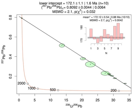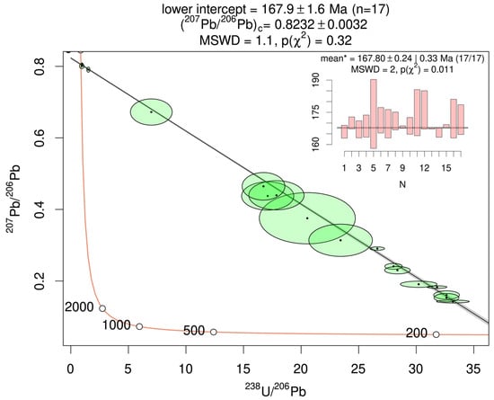 - Sláma, J.; Kosler, J.; Condon, D.J.; Crowley, J.L.; Gerdes, A.; Hanchar, J.M.; Horstwood, M.S.A.; Morris, G.A.; Nasdala, L.; Norberg, N.; et al. Plesovice zircon—A new natural reference material for U-Pb and Hf isotopic microanalysis. Chem. Geol. 2008, 249, 1–35. [Google Scholar] [CrossRef]