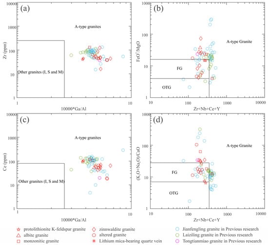 Granite discrimination diagram of granite genetic type (modified from [55]): (a) 10,000 Ga/Al vs. Zr; (b) Zr + Nb + Ce + Y vs. FeOT/MgO; (c) 10,000 Ga/Al vs. Ce; (d) Zr + Nb + Ce + Y vs. (Na2O + K2O)/CaO. FG—fractionated felsic granite; OTG—other I-, S- and M-type granite.