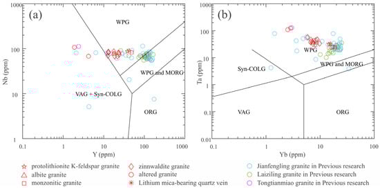 Granite discrimination diagram of the tectonic setting (modified from [62]): (a) Y vs. Nb; (b) Yb vs. Ta. Syn-COLG—syn-collisional granite; VAG—volcanic arc granite; ORG—ocean ridge granite; WPG—within plate granite; MORG—mantle-derived ocean ridge granite.