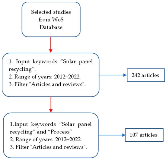 - The identification of studies in the database: The search for studies was performed in the Web of Science (WoS) database in December of 2021 using the keywords “solar panel recycling” as presented in Figure 1. The management of these articles was performed through the Mendeley software (2.74.0) to eliminate duplicate articles and multiple studies by the same author.