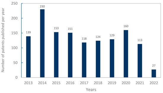Number of published photovoltaic recycling treatment patents by year, from 2013 to 2022.