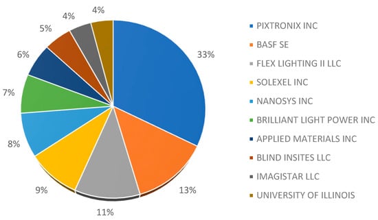 Figure 4 shows that the largest number of patents granted to applications corresponds to PIXTRONIX INC (Andover, MA, USA), a company that develops optimized visualization technologies for multimedia devices, accounting for 32% of the patents obtained. This is followed by companies such as BASF SE (Ludwigshafen am Rhein, Germany) (chemical company), FLEX LIGHTING II LLC (Chicago, IL, USA) (manufacture of electric lighting equipment), SOLEXEL INC (Milpitas, CA, USA) (solar photovoltaic technology), and NANOSYS INC (Milpitas, CA, USA) (development and manufacture of nanotechnology materials), among others, each accounting for 10% of the patents obtained in the search.