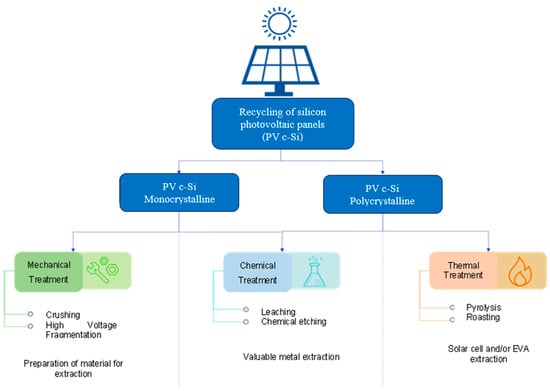 Figure 5 summarizes the main methods of treatment of the photovoltaic solar panels used, highlighting the mechanical, chemical, and thermal treatments analyzed in this study.
