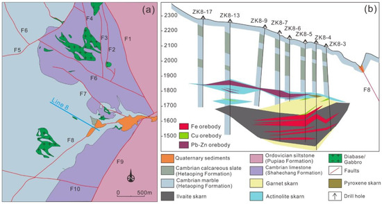 (a) Geological map of the Jinchanghe Pb-Zn polymetallic deposit (Modified from [8]); (b) alteration and mineralization characteristics of No. 8 exploration line in the Jinchanghe Pb-Zn polymetallic deposit (Modified from [8]).