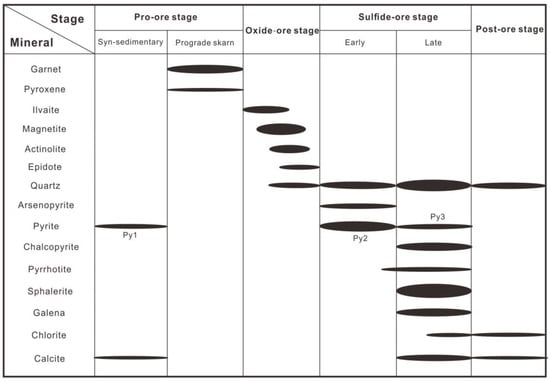 Based on the systematic geological investigation and microscopic observation, four main mineralization stages have been identified, including the pre-ore stage characterized by prograde garnet and pyroxene, the oxide-ore stage represented by Fe mineralization associated with ilvaite, epidote and actinolite, a sulfide-ore stage characterized by Pb-Zn-Cu sulfides and post-ore stage with barren calcite and quartz veins (Figure 3).