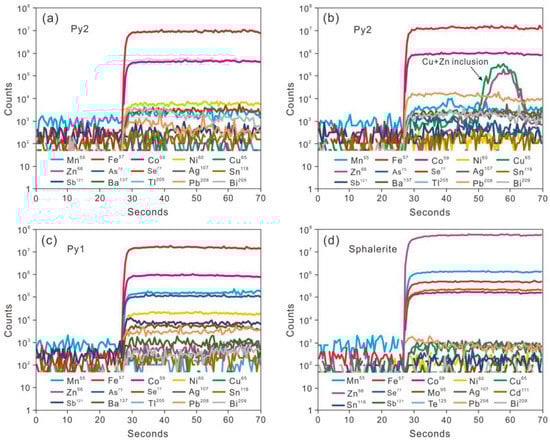 Typical time-resolved analytical signals LA-ICP-MS. (a) early sulfide-ore stage pyrite with isomorphic trace elemental substitutions; (b) early sulfide-ore stage pyrite with Zn-Cu inclusions; (c) syn-sedimentary stage pyrite with isomorphic trace elemental substitutions; (d) late sulfide-ore stage sphalerite with isomorphic trace elemental substitutions.