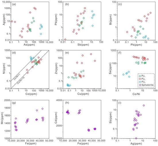 Binary plots of (a) Ag vs. As, (b) Pb vs. Sb, (c) Bi vs. Pb, (d) Ni vs. Co, (e) Zn vs. Cu, (f) Se vs. Co/Ni in pyrite, and (g) Mn vs. Fe, (h) Cd vs. Fe, (i) Sb vs. Ag in sphalerite from the Jinchanghe Pb-Zn polymetallic deposit.