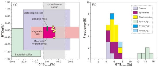 (a) Plot of δ34SCDT vs. δ65Cu (Modified from [45]) for chalcopyrite, (b) histogram of δ34S values of sulfides from the Jinchanghe Pb-Zn polymetallic deposit.