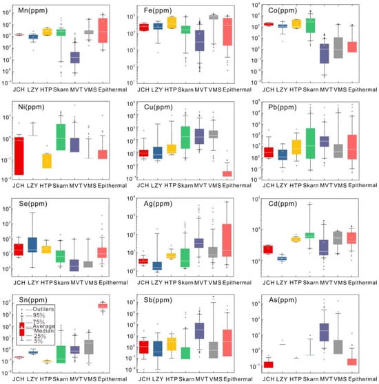 Comparative box of trace elemental concentrations in sphalerite from the the Jinchanghe Pb-Zn polymetallic deposit (Other data are cited [9,10,18,54,59,60]). HTP = Hetaoping skarn Pb-Zn deposit; LZY = Luziyuan skarn Pb-Zn-Fe deposit.