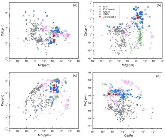 Binary plots of (a) Cd vs. Mn, (b) Co vs. Mn, (c) Fe vs. Mn and (d) Mn vs. Cd/Fe in sphalerite from the Jinchanghe Pb-Zn polymetallic deposit (Other data are cited [9,10,18,54,59,60]).