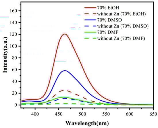 Given the propensity for the luminescence of most fluorophores to be impacted by the surrounding environment, an initial assessment was conducted to evaluate the solvent’s impact on the detection system. The data presented in Figure 1 elucidate that different aqueous solvents—EtOH, DMSO, and DMF—when employed as media for the probe, result in varying levels of fluorescence response. The effectiveness of these aqueous solvents in enhancing fluorescence followed the hierarchy EtOH > DMSO > DMF. Consequently, 70% EtOH emerged as the solvent of choice due to its superior ability to enhance fluorescence, thereby optimizing the performance of the detection probe.