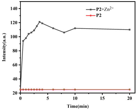 For the response time test, the Zn2+ stock solution was mixed with the probe solution and diluted with 30% water content in EtOH to be the test solution, in which the concentration of zinc ions and P2 were both 100 μM. Fluorescence spectra measurements were taken every 30 s to determine the optimal incubation time. At the same time, a blank group without zinc ions was set up to eliminate the fluorescence interference of the detection system itself.