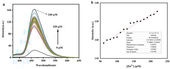 Titration curve of Zn2+: (a) fluorescence spectrum changes of different concentrations of Zn2+ solution (0–320 μM) added to the fluorescence detection system (λex = 352 nm); (b) the linear relationship between fluorescence intensity and concentration (60–220 μM).